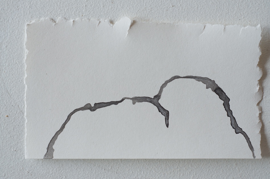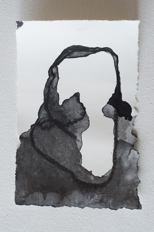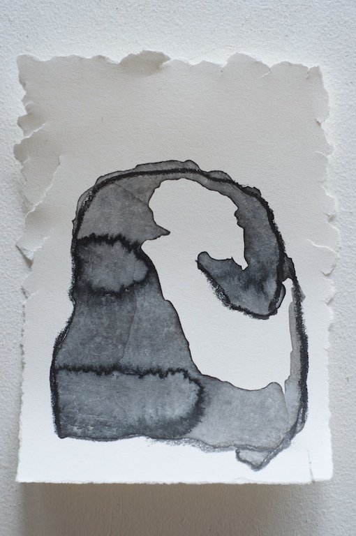 I also did some sketches with ink and water. The color from my favorite one (which sorta looks like a dong) came from the unwashed interior of the squeezie thing with which I applied a big puddle of water to the paper. Once the puddle had a shape that worked, I added black ink by touching a wooden, ink-saturated skewer tip to the surface. I really like the results.
