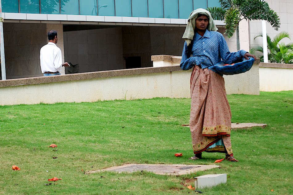 This woman, from I could tell, was employed as grounds keeper. When I snapped this I just thought she was picking up the pretty orange flowers for some decoration. The nicely woven basket sure didn't seem like a receptacle for trash. That still might be true as a lot of the cars, bikes and buses sported beautiful strung flowers across them, most likely for Diwali. But, as I drove by each day, she was doing other, similar tasks as well. Yesterday, as a result of a big rain, she was scooping water out of large puddles in the street and pouring into the bushes using a cutoff water bottle. A we drove by, Srinivas made sure not to splash her as she stared me down with a look of indifference. It was difficult to meet her eyes.