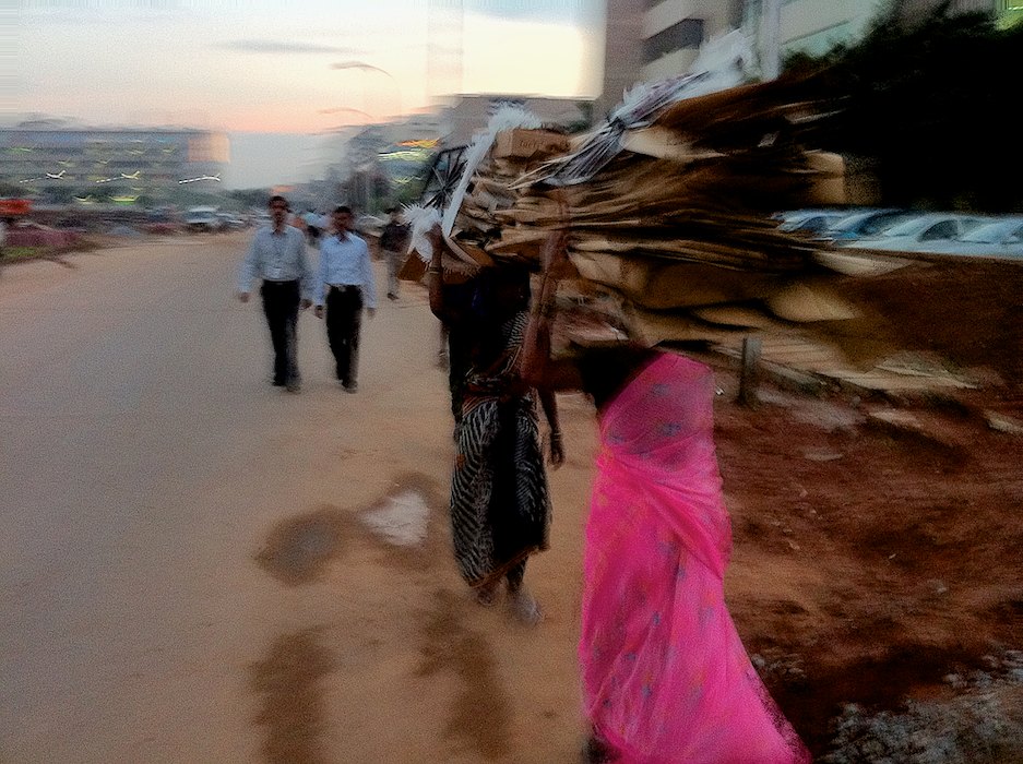 This is the business park where the office is located. On the walk back from some really horrible coffee, I grabbed a blurry image of women recycling cardboard. The cardboard is neatly stacked, tied and balanced on their heads. Some stacks I saw were probably 3 feet thick.