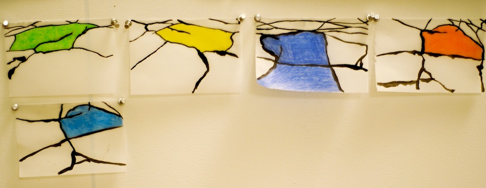 Quick sketches of street tar contours with ink and colored pencil on velum.